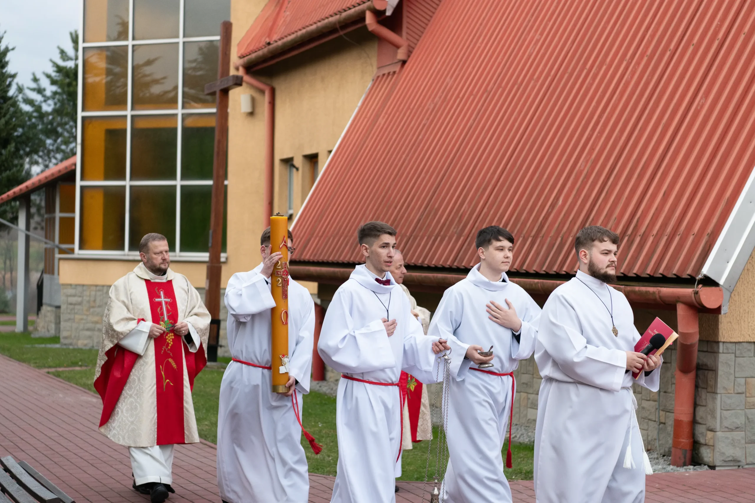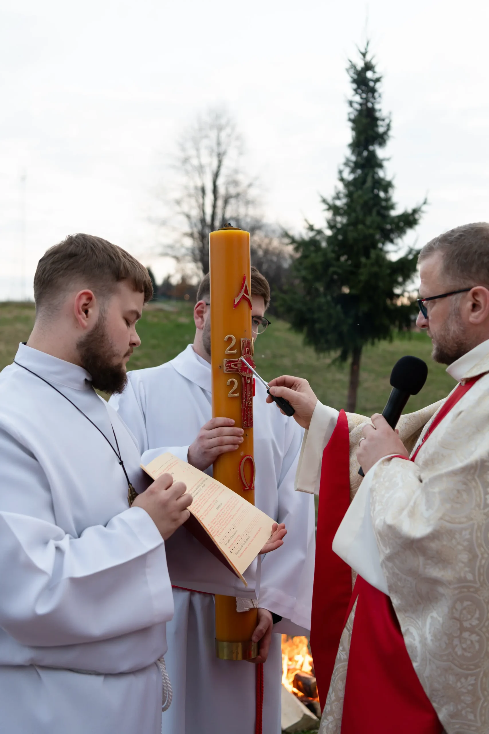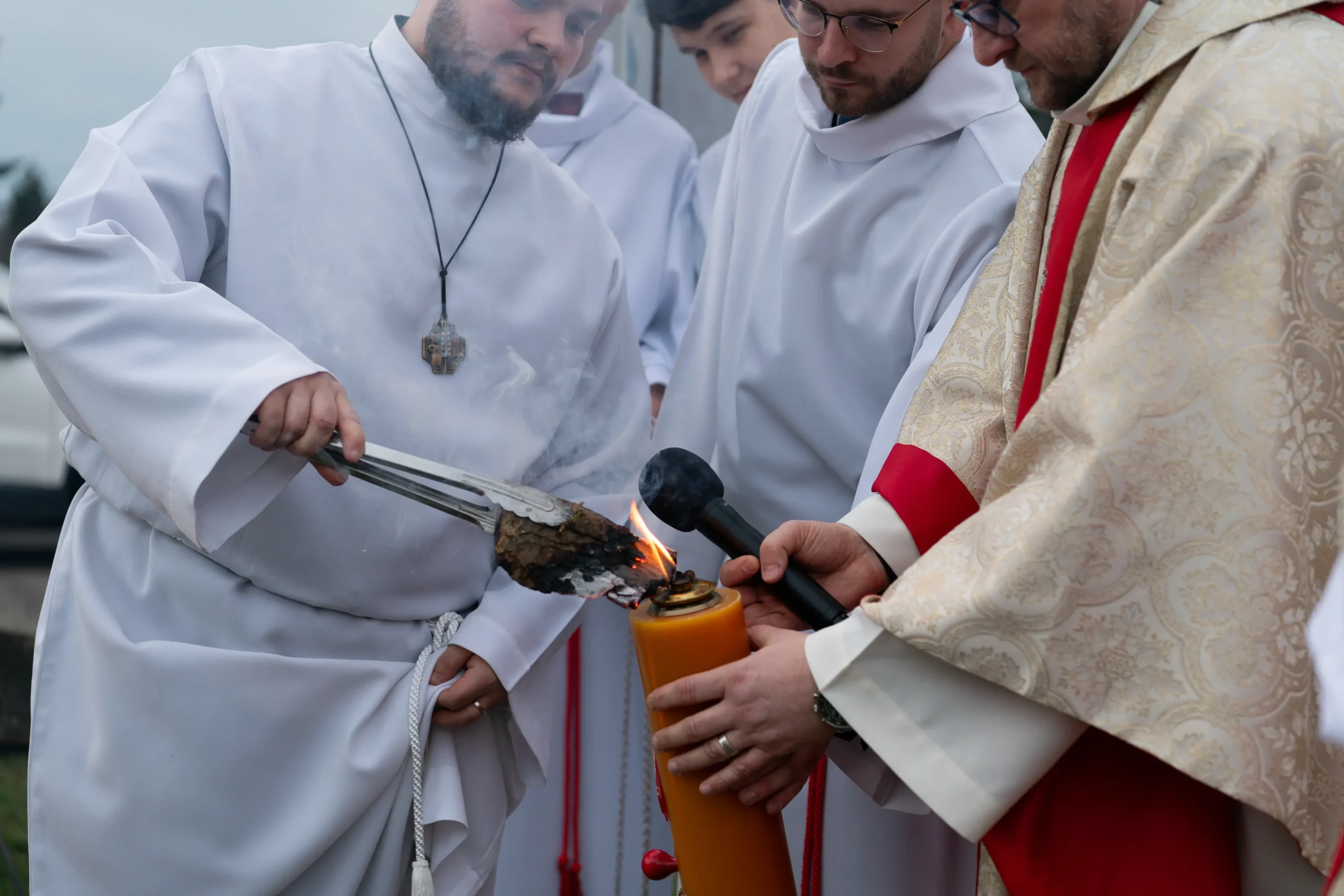 Liturgia rozpoczęła się od poświęcenia ognia i zapalenia paschału – znaku Chrystusa Zmartwychwstałego. W procesji wniesiono go do ciemnej świątyni, gdzie zabrzmiało „Światło Chrystusa”, a wierni zapalili swoje świece. Następnie odśpiewano uroczyste orędzie wielkanocne – Exsultet.